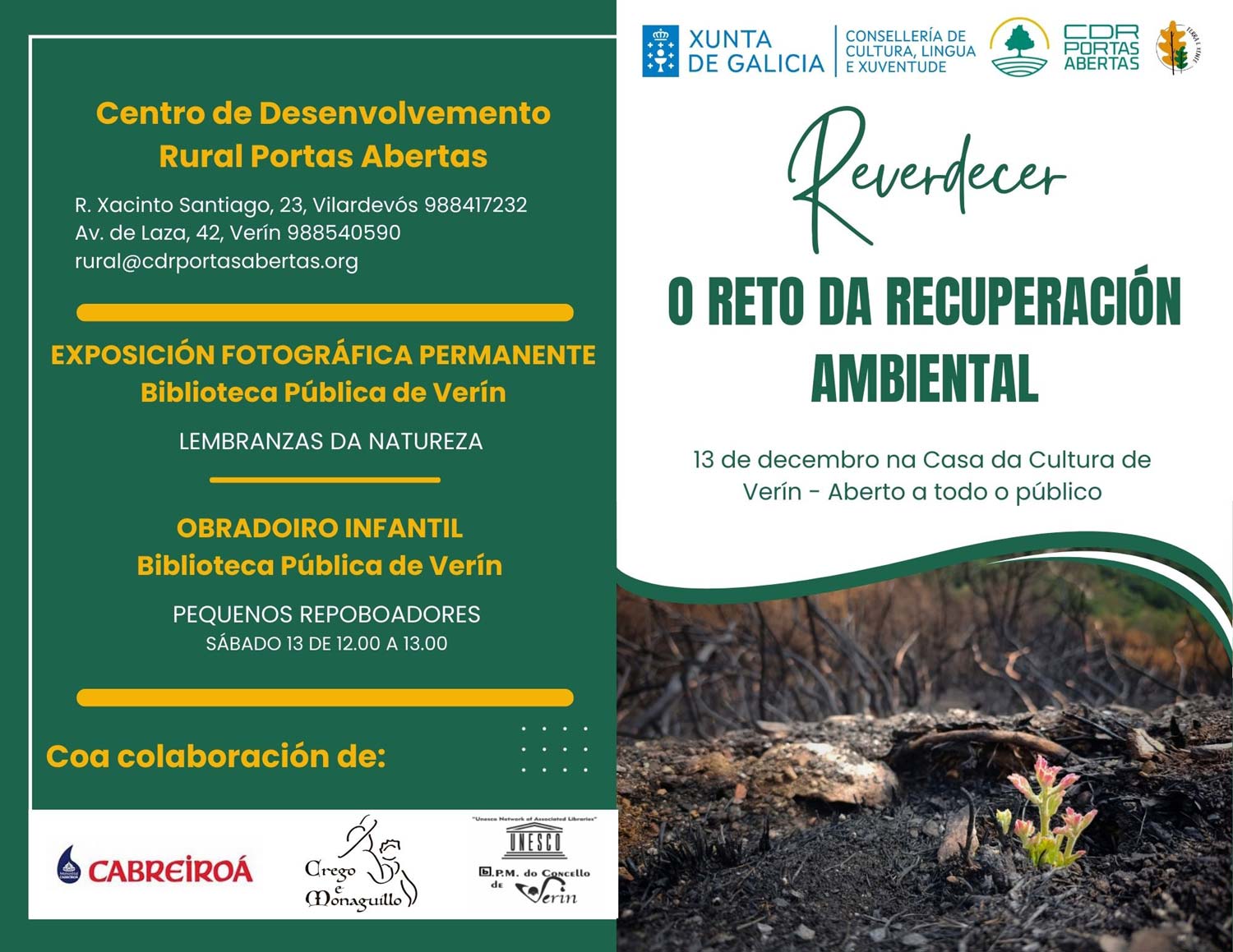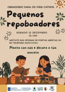 O vindeiro 13 de decembro de 12:00h a 13:00h. teremos a actividade «Pequenos repoboadores» dentro da xornada «Reverdecer: O reto da recuperación ambiental» organizada por CDR PORTAS ABERTAS.